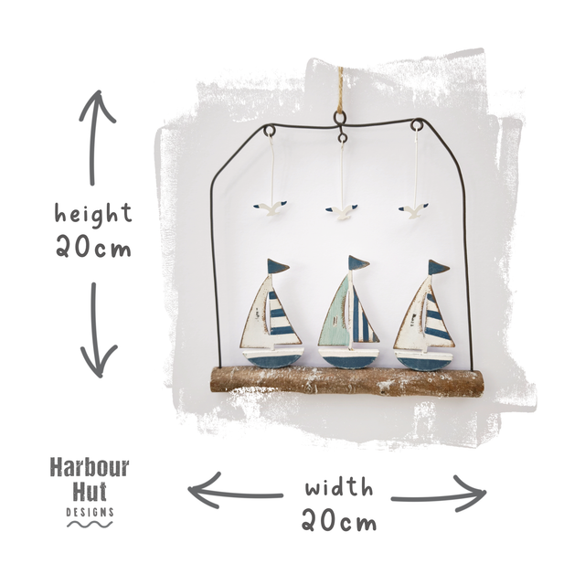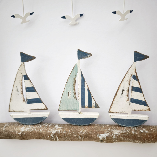 Hanging off the twine is a frame of wire and a wooden branch. Cute metal seagulls hang off the wire frame. Boats sit on the white washed wooden driftwood branch.