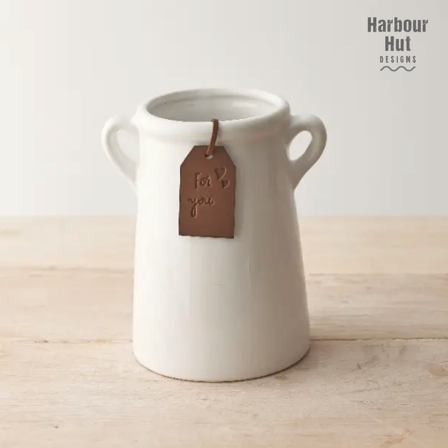 The vase has a small whole on one side for a faux leather tag to hang off the jug. The tag is printed with the words ‘for you’ and has 2 hearts stamped on it. The other side of the vase is plain.