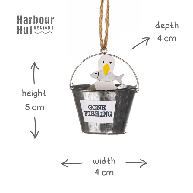 The seagull is sat with his fish in a metal bucket and the sign 'gone fishing'