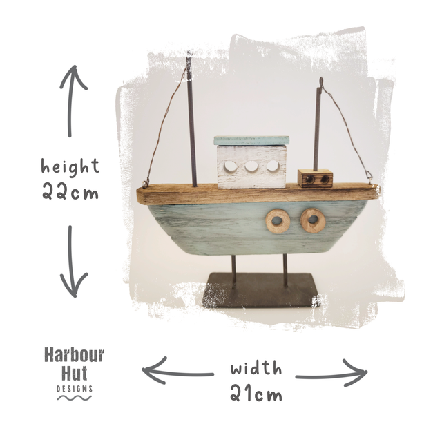 This sailing boat is very rustic, made with recycled/upcycled, slightly burnt wood, so each boat is individual. It sits on a rust effect, distressed looking metal base.