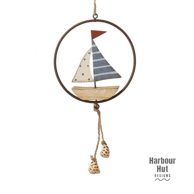 Hanging off the twine is a circular wire frame. A cute wooden boat sits on the wire frame with 2 shells dangling down.