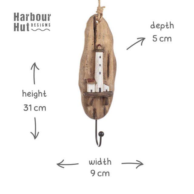 Hanging off the twine is a wood plaque with a rustic painted lighthouse. Attached to the wood is a rustic metal hook.