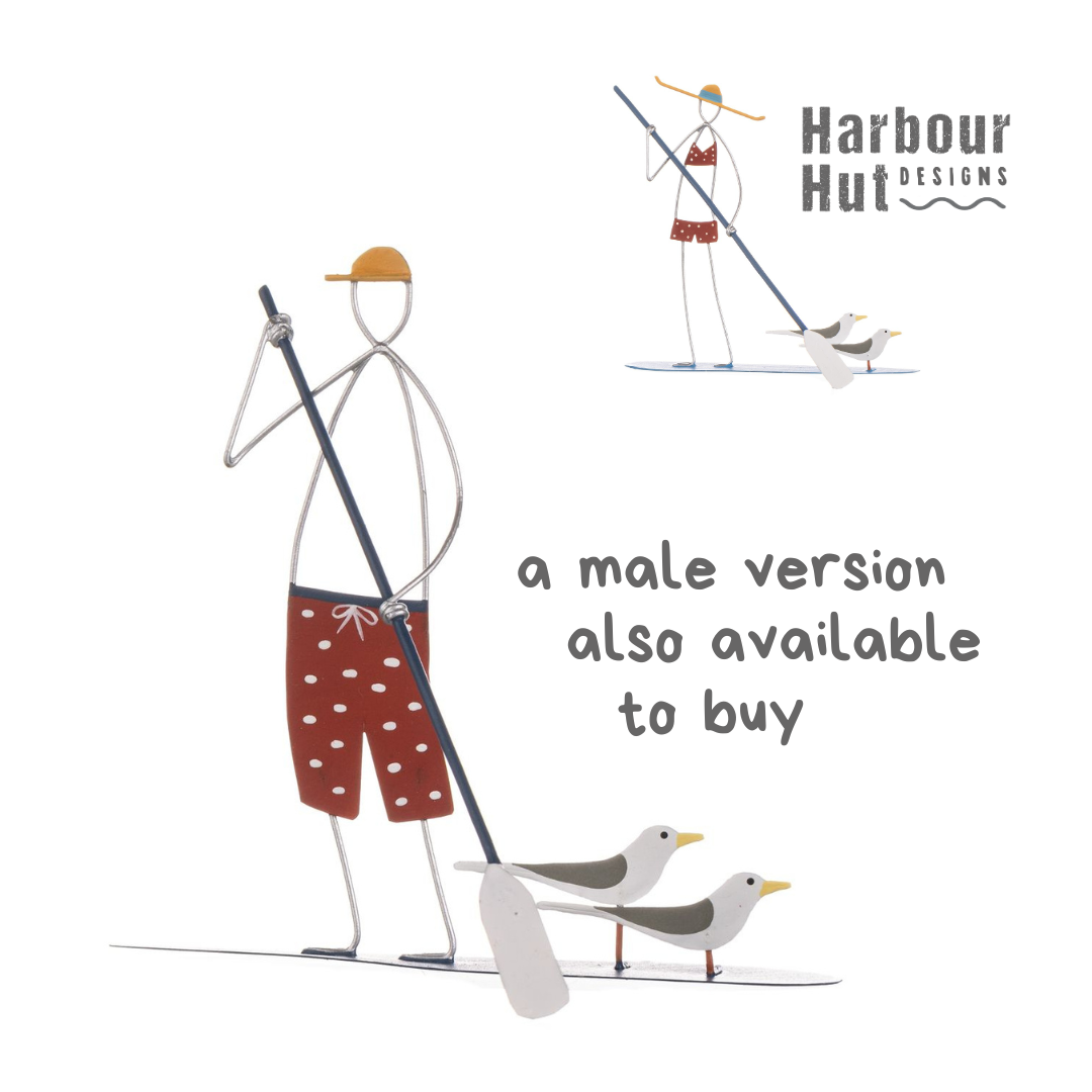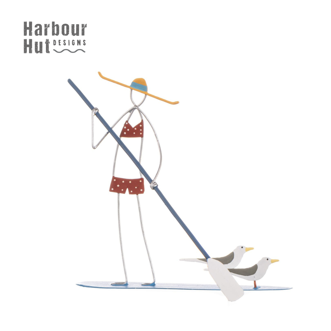 Girl paddle boarding sculptured in metal, with seagulls in tow.