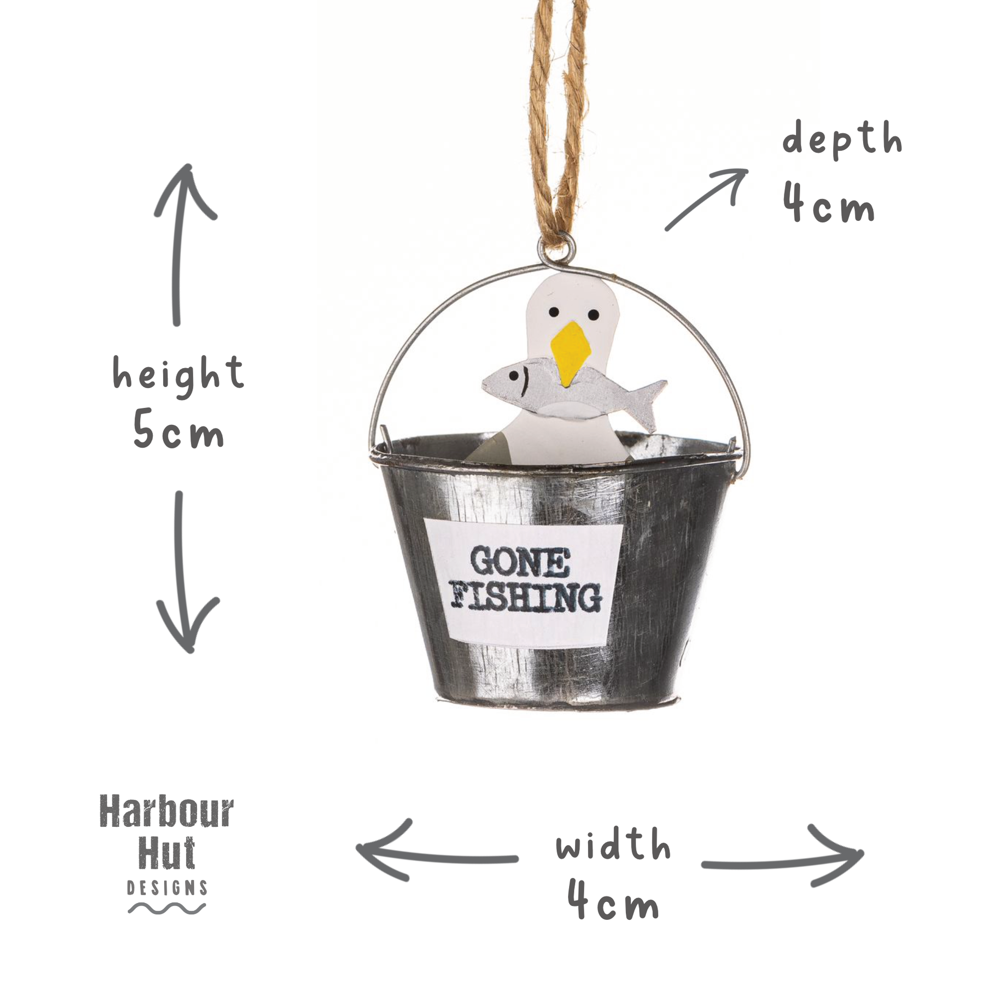 A quirky seagull (who has successfully gone fishing) sits in his metal bucket.