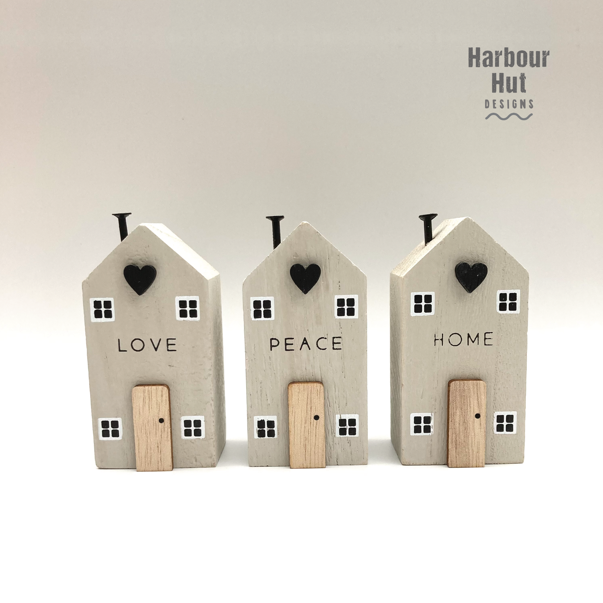 Small wooden houses painted in beige, with a nail for the chimney and a heart motif.